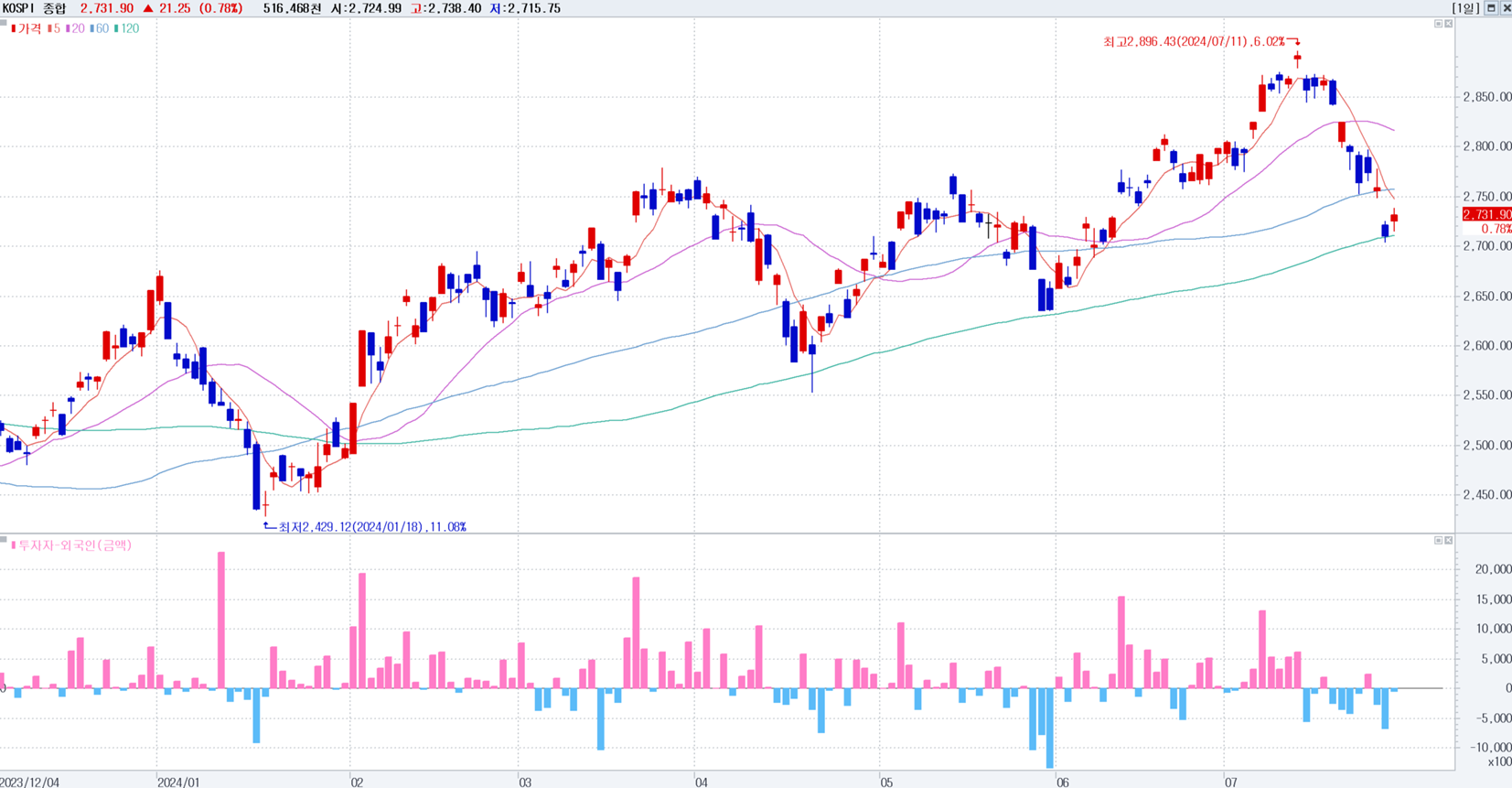 말 그대로 조정, 상승장 지속 다시 하락장으로 꺾인 모습은 나타나지 않는다. 말 그대로 조정, 머지않아 다시 3000을 넘길 것으로 생각된다. 주봉으로 봐도 20주선을 타며 오르며 지금은 반등할 위치까지 내려왔으며, 일봉으로 보면 120일선을 아주 뚜렸하게 타면서 반등할 위치에 서있다. 현 시점 한국 주식 시장을 이끄는 종목들 반도체, 조선, K-푸드, 전력, 방산, 금융 주식들을 들고 그대로 가야할 시간이다. 한국주식이야기 2024.07.28