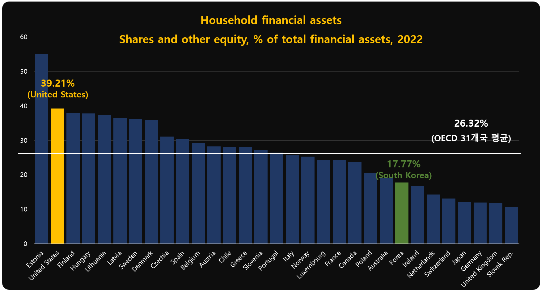 미국인들의 주식 보유 비중 39.21% OECD에서 집계한 OECD 31개국의 전체 자산에서 차지하는 주식 보유 비중입니다. 미국은 에스토니아를 제외하면 가장 높은 39.21%를 전체 자산에서 주식 형태로 보유하고 있고 한국은 17.77%입니다. 미국주식에 투자해야하는 이유 2024.07.28